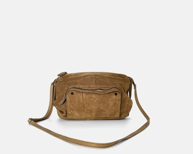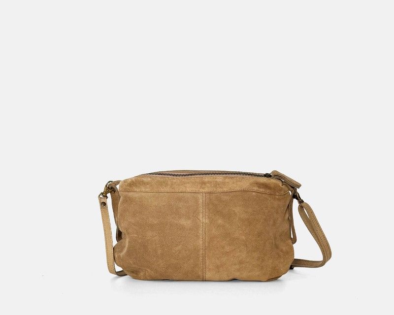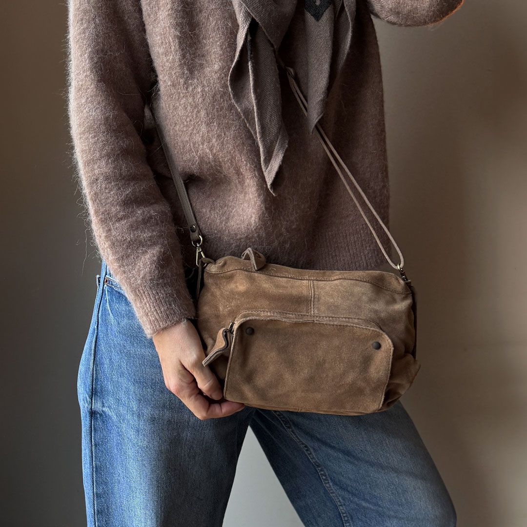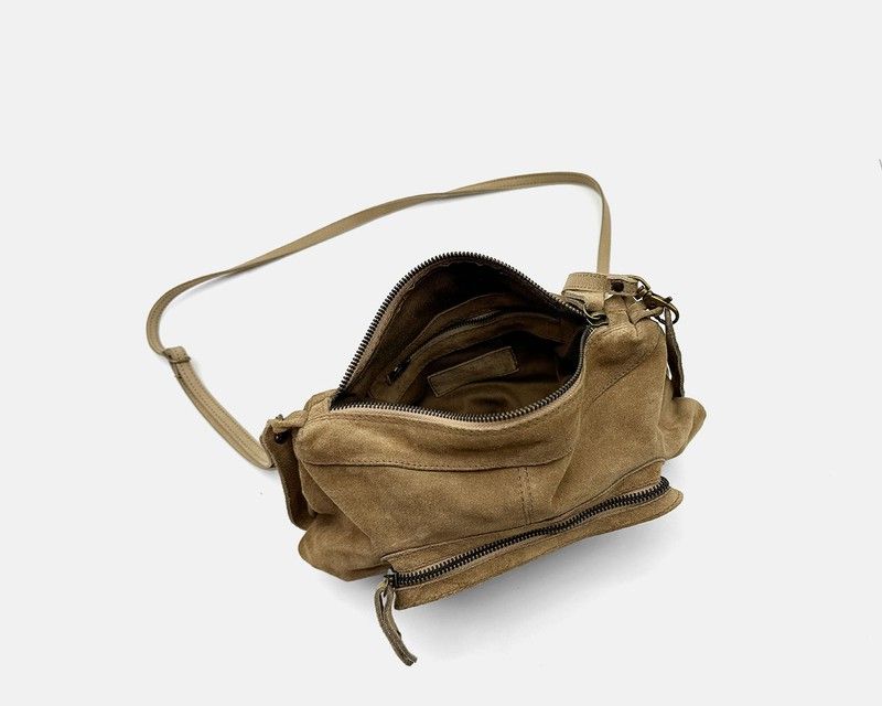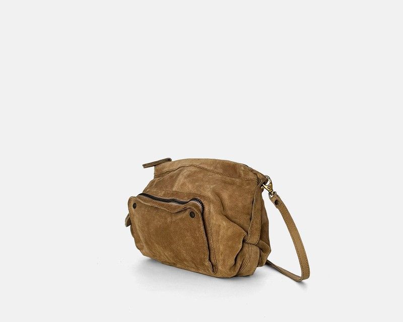 Bandolera de piel serraje pequeña para llevar lo imprescindible. Con bolsillo frontal cerrado con cremallera y asa de piel.
