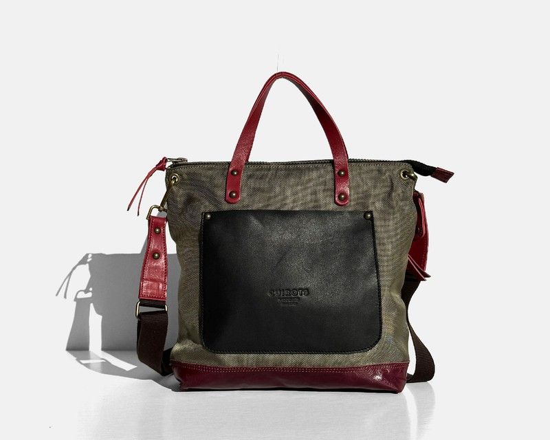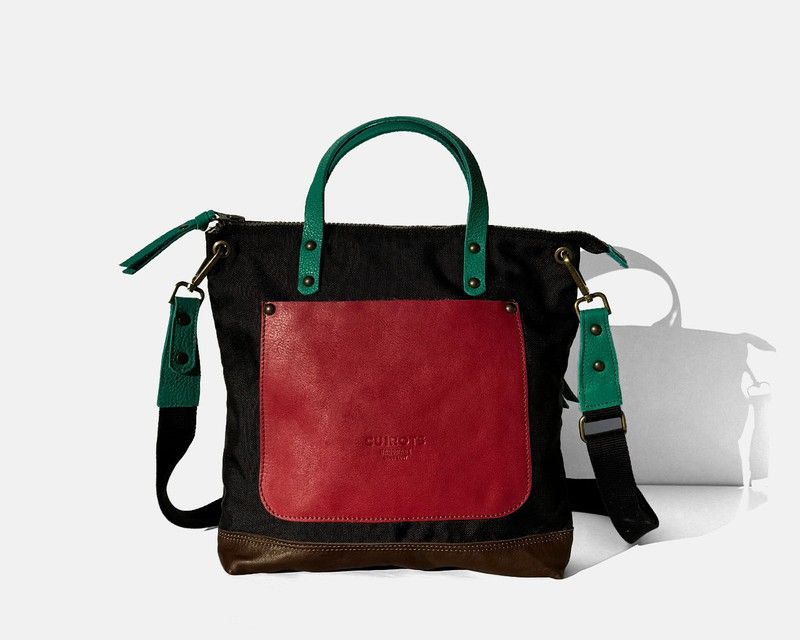 - Burdeos - Base cordura negra, bolsillo de piel rojo, base marrón y asa verde