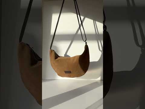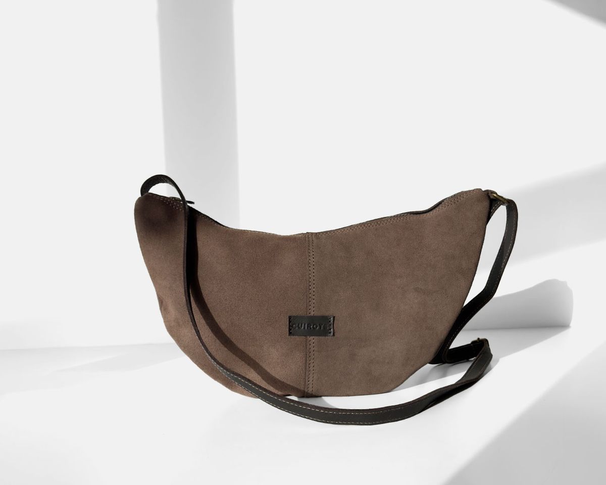 Bolso bandolera pequeño en forma de media luna, confeccionado con serraje combinado con piel en color marrón. Bolso con bolsillo interior cerrado con cremallera de tejido. Bolso sin forro.