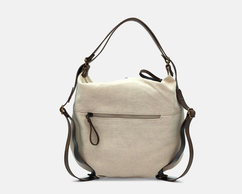 Bolso mochila pequeño de lona, asas extensibles para colgar como mochila o bolso de hombro. Su tamaño y tejido hacen que sea ligero y práctico.